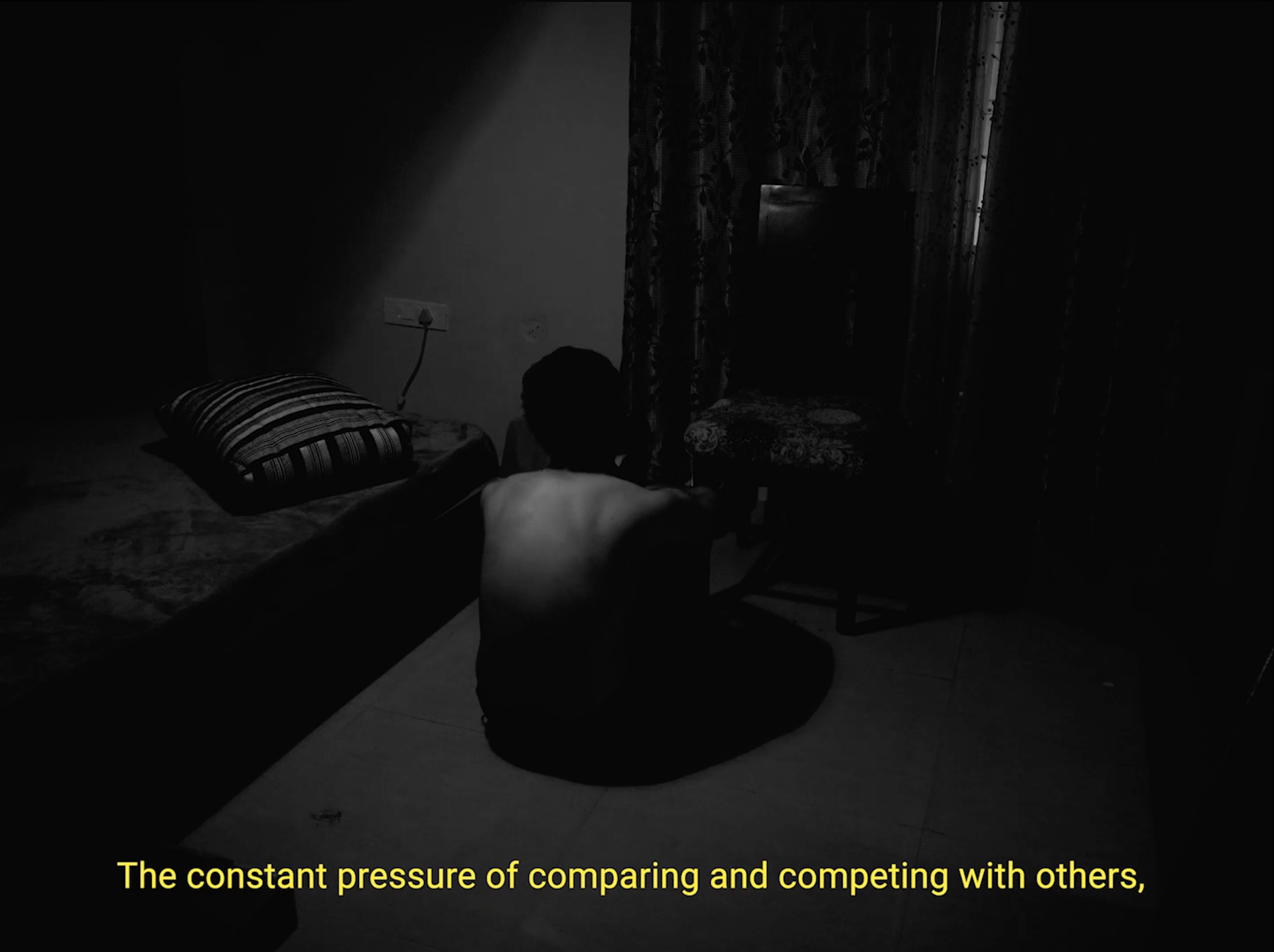 Rather than spoken dialogue, the film employs subtitles as a direct window into his thoughts — emphasizing that the conflict exists entirely within his mind. The absence of audible speech reinforces isolation, while the fixed camera positions create emotional distance and a sense of paralysis.